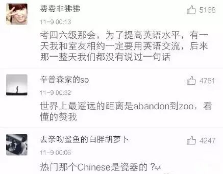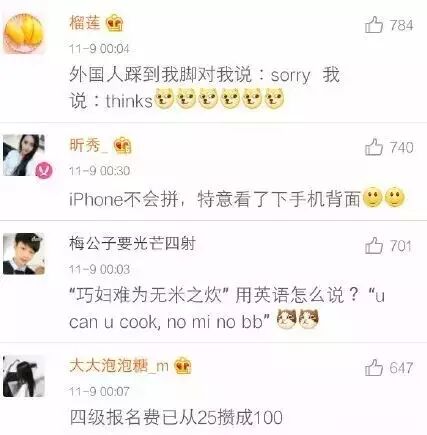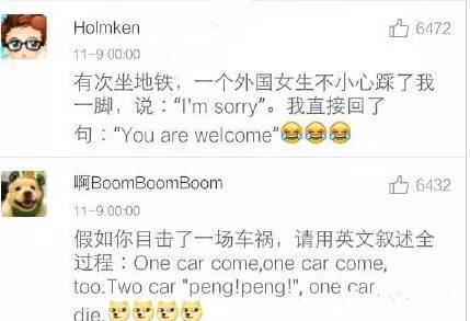 不要一句话暴露了你的英文水平 发布时间:2017-10-04 10:50:27作者:春喜外语来源:www.tracyclass.com浏览量: (转载请注明出处:春喜外语外教一对一、少儿外教一对一、在线英语培训) 本文章由春喜在线英语于2017.10.4日编辑发布 江湖上的大神包括部分老司机都是拿秀英语当成, 瞬间提升形象(逼格)的犀利手段, 简直惨绝人寰、丧尽天良。连教他们英语的体育老师要哭晕在厕所! 接着我们来看下一些网上的老司机的留言: 本文标签: 上一篇:学英语这些年,你被这些误导了吗? 下一篇:十句生活常用语,改用英语来说吧!